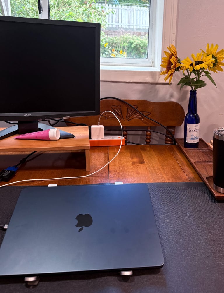 My simple work desk faces the window, with a clear view of my little garden. On it sits a recycled beer bottle I use as a vase — because it’s beautiful in its own way — holding a bright sunflower freshly picked from my garden.