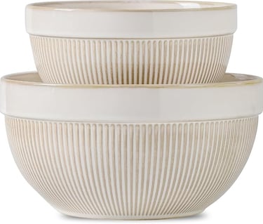 This set of two bowls (10-inch and 8-inch) blends classic design with warmth and function. The yellow striped rim adds a cheerful, vintage touch, while the white ceramic base keeps it timeless and simple. Perfect for mixing dough, tossing salads, or serving popcorn on cozy evenings — they’re as practical as they are beautiful.