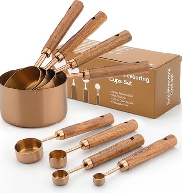 Warm kitchens, morning light, and the quiet rhythm of baking — that’s what the Measuring Cups and Spoons Set with Wood Handles (Bronze) brings to your countertop.