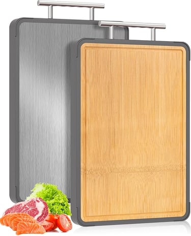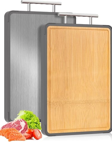 Thoughtfully made with food-grade titanium on one side and eco-friendly bamboo on the other, this board is both beautiful and functional. The titanium surface is non-toxic, slip-resistant, and easy to clean, making it perfect for preparing meats and vegetables. Flip it over, and the bamboo side becomes an elegant serving board for cheese, fruit, or charcuterie — ideal for quiet gatherings or everyday meals.